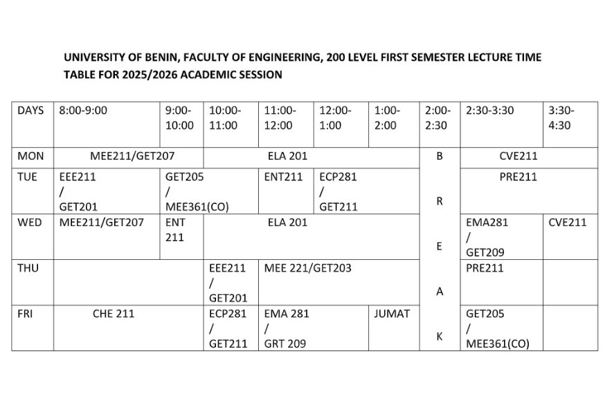 Engineering is built on systems and reliability. In line with this, a new directive has been issued for all 200-level students: class updates will no longer be manually posted. From this point forward, the official University of Benin Faculty of Engineering timetable is the primary source of truth for your daily schedule.